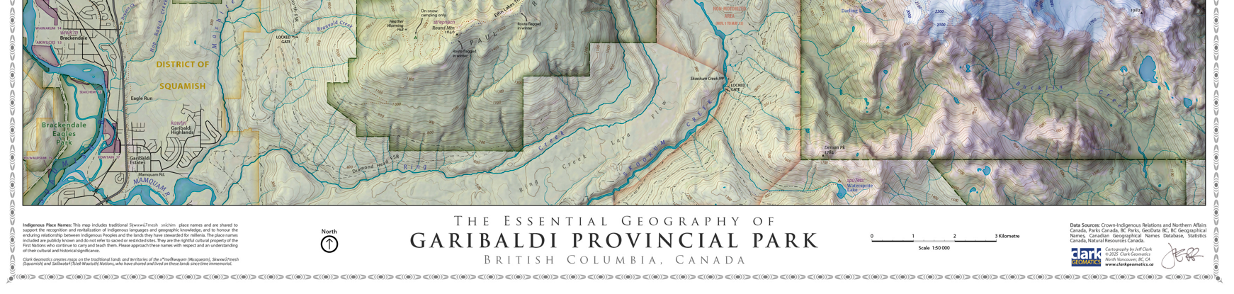 This beautiful map, a longtime hiking crowd (and BC Parks ranger) favourite in its folded form, captures the beautiful landscape of BC's crown jewel – Garibaldi Provincial Park. Folks have been asking for a wall map (not folded) version for years - well, here it is! This is THE reference map for the park. Created from over 50 different layers of data, this map is a pleasure to pore over, it has details and place names you've never seen before. This map also makes a fantastic memento of your hikes in the park.